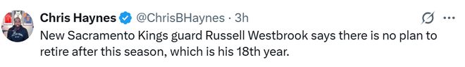 雷速体育10月20日讯 据名记Chris Haynes报道,国王新援卫威斯布鲁克在接受媒体采访时表示,目前并无在本赛季结束后退役的打算。